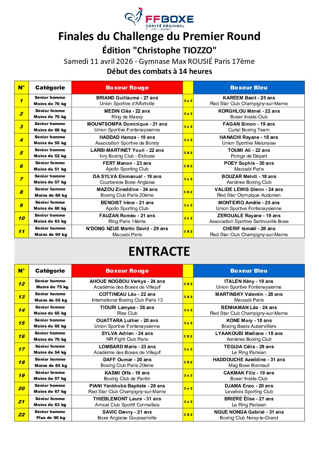 Le programme officiel est désormais disponible, avec pas moins de 22 combats prévus tout au long de l’après-midi. Des affrontements variés, opposant des boxeurs et boxeuses issus de nombreux clubs franciliens, dans toutes les catégories de poids.
